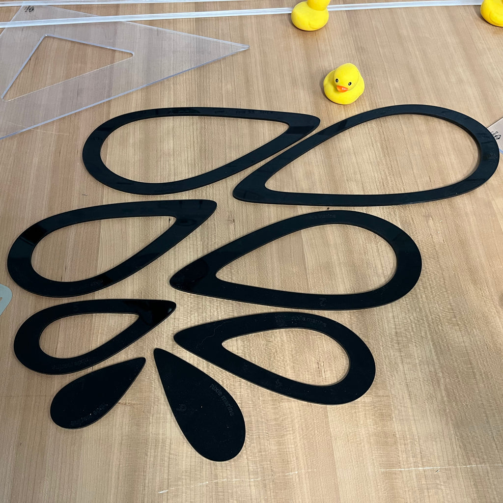 The set includes eight curves, ranging in length from approximately 12 inches to 3 inches, and is laser-cut from 3 mm opaque acrylic for accuracy, durability, and smooth drafting performance.